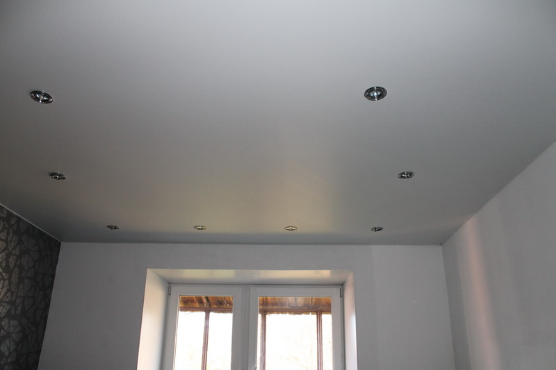 Классический, матовый натяжной потолок, с интерьерными, точечными светильниками