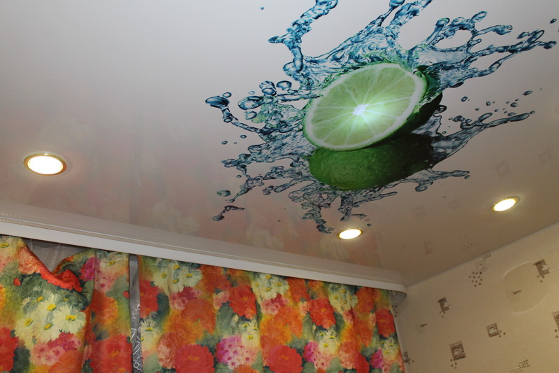 На кухне глянцевый потолок с фотопечатью