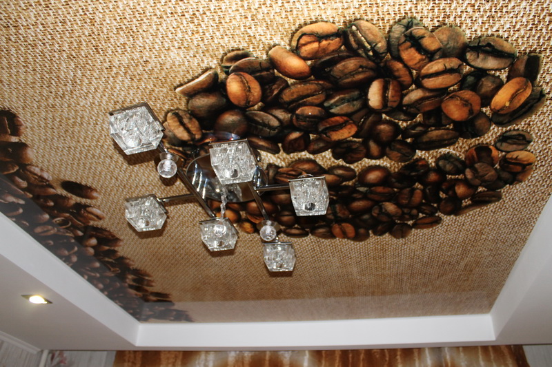 На кухонном потолке фотопечать кофейные зерна на лаковом потолке