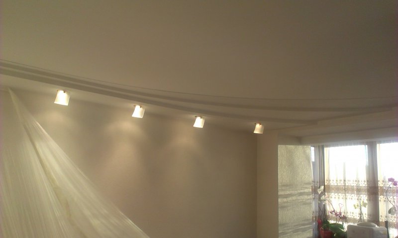 - Специальная тонкая сетчатая ткань, пропитанная полиуретаном. Максимальная ширина рулона при этом составляет 5 метров, за счет чего на поверхности потолка отсутствуют швы.