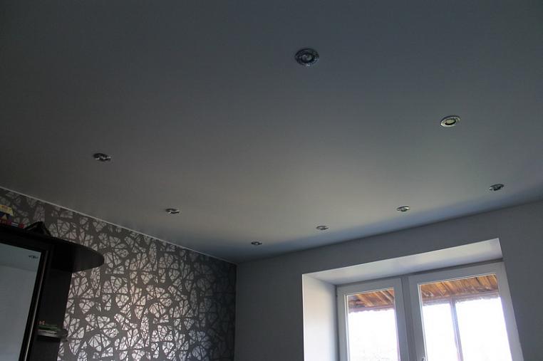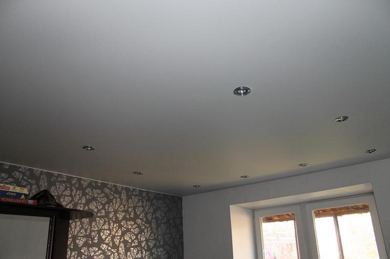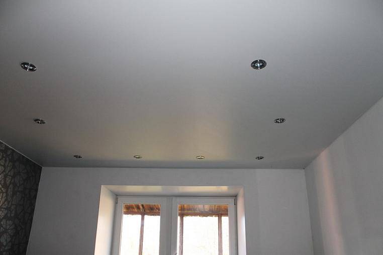 Классический, матовый натяжной потолок, с интерьерными, точечными светильниками