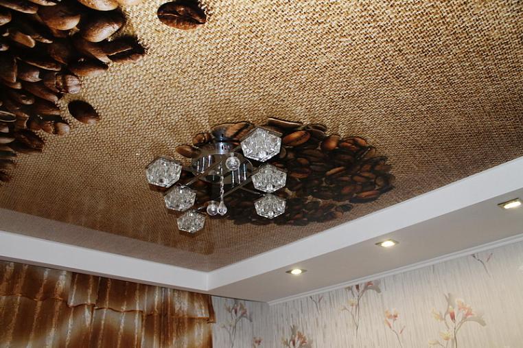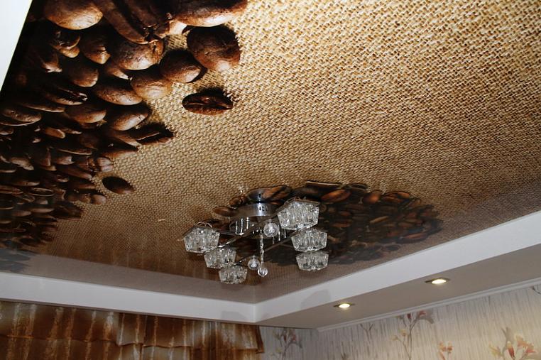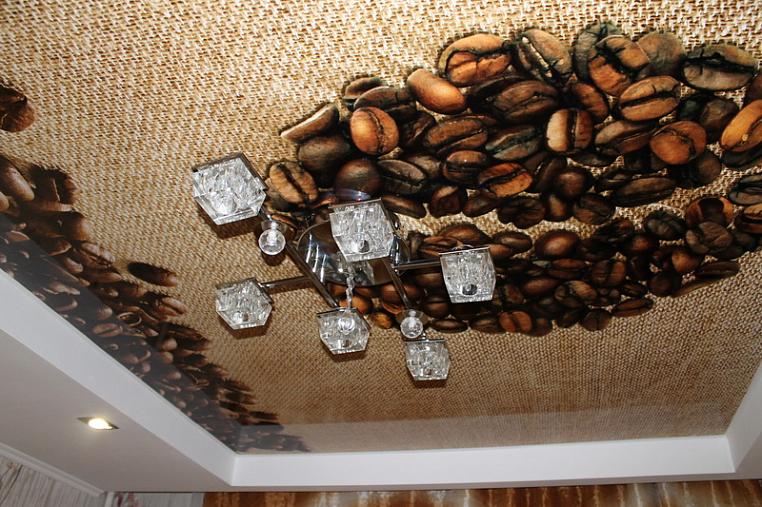 На кухонном потолке фотопечать кофейные зерна на лаковом потолке